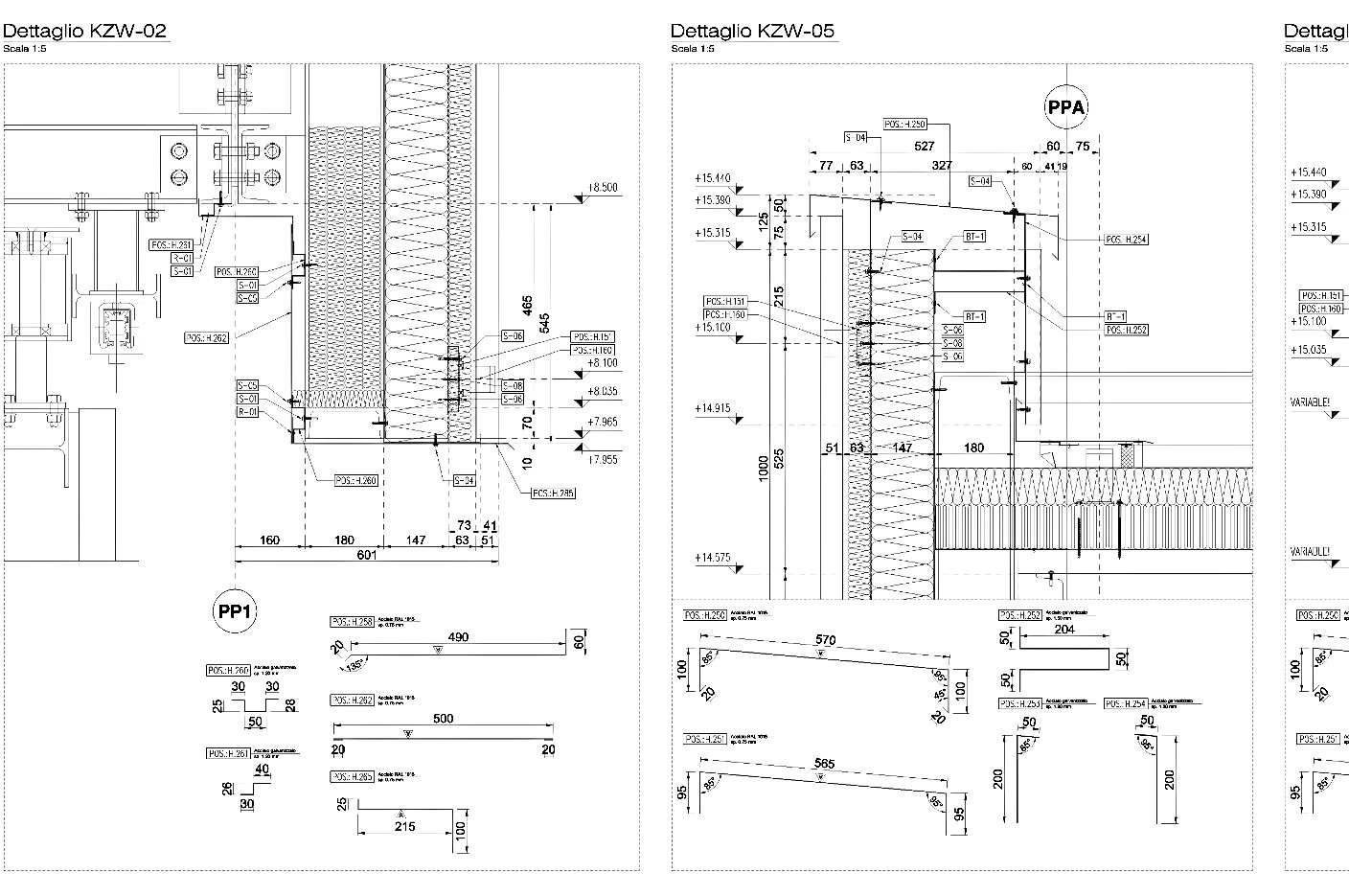 Le coperture degli shelter e dell’hangar sono realizzate con pannelli profilati in alluminio Kalzip 50/429 finitura stucco su lamiera portante in acciaio, mentre le facciate dell’hangar sono rivestite in pannelli profilati in alluminio Kalzip 50/429 RAL 1015 su cassette portanti in acciaio.